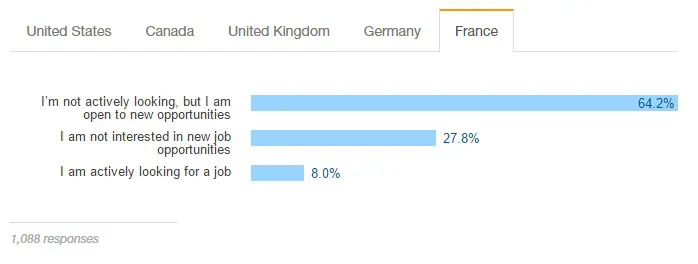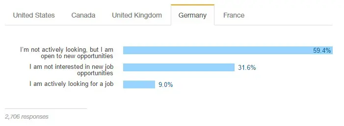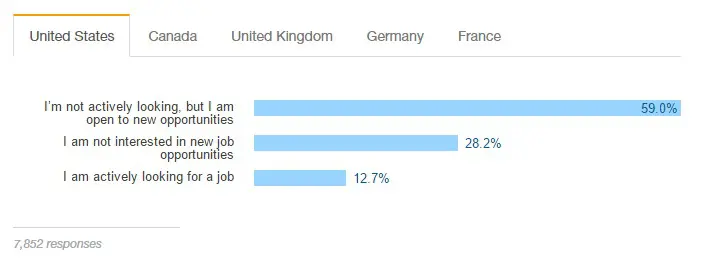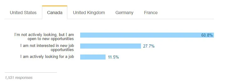 在所有受访者中,目前只有13.1%的人在求职过程中。但是75.2%的受访者对新机会有兴趣。