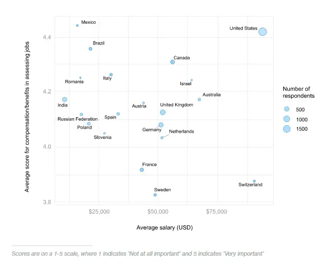 墨西哥和巴西的开发者薪水最低,他们也非常看重待遇。在瑞士和瑞段,开发者最补贴和福利的重视程度最低。