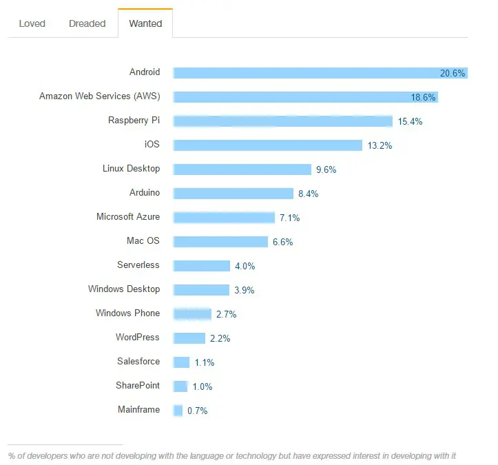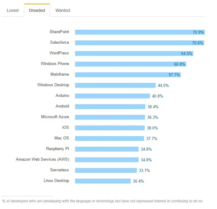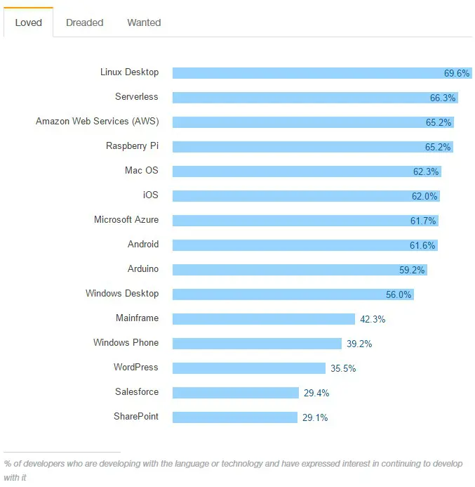 Desktop成为最受喜爱平台。Sharepoint为最让人头疼平台。安卓成为开发者最想使用的平台。