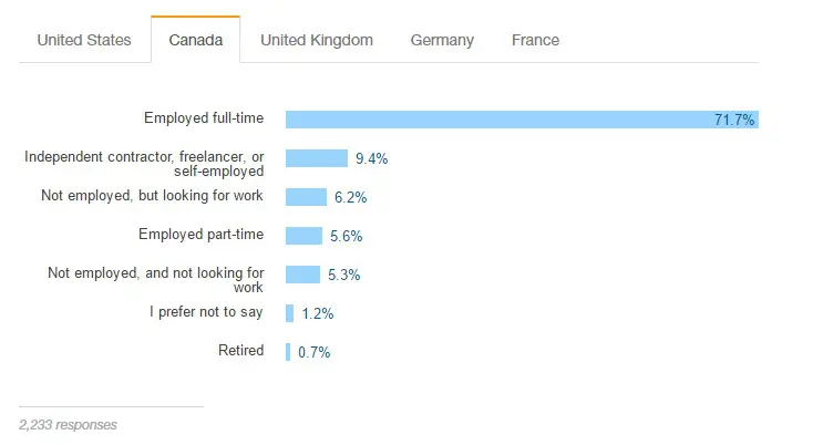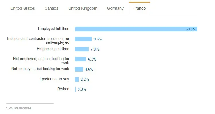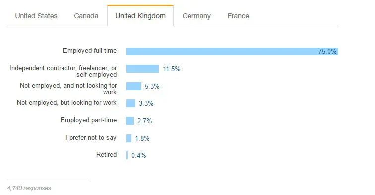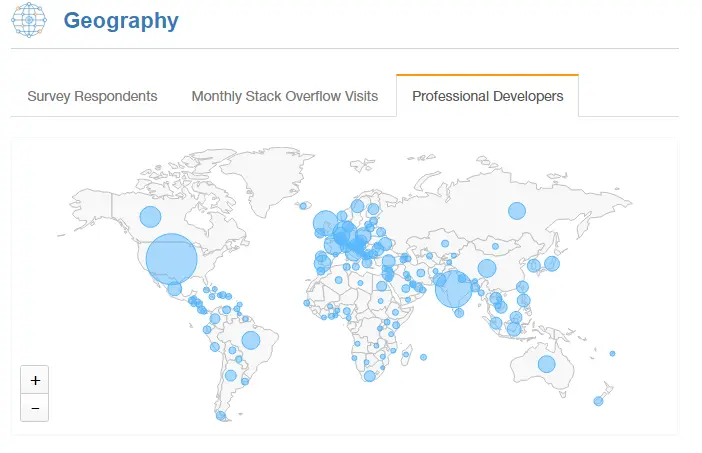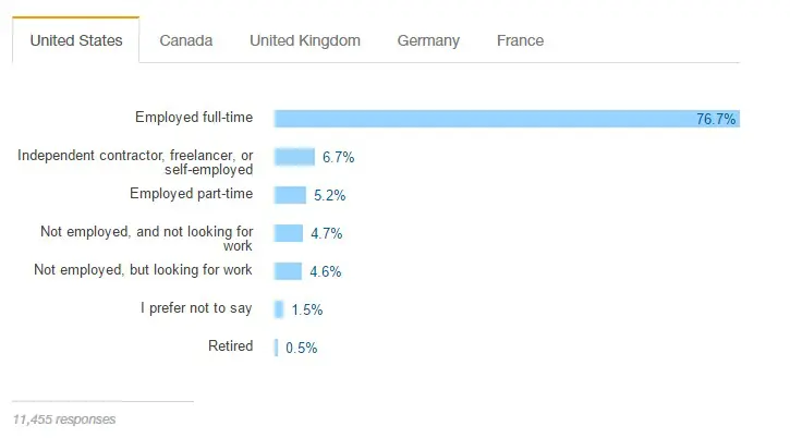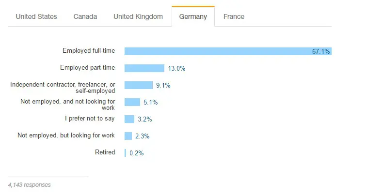 相比世界其他地区,美国的自由职业、合同工和自我雇佣开发者比例较低。德国的兼职开发者比例尤其的高。