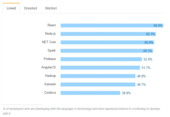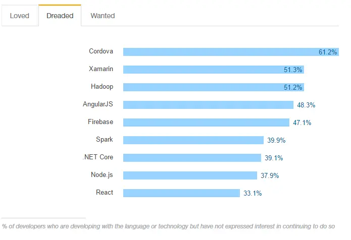 React最受开发者喜爱、Cordova最让开发者感到头疼,Node.js为开发者最想使用的框架。