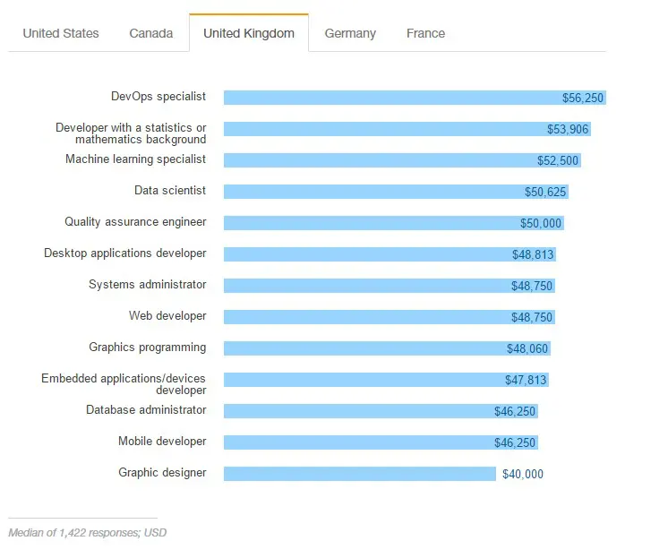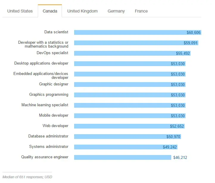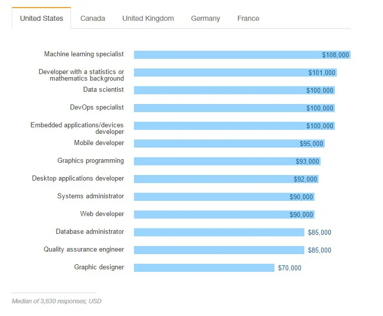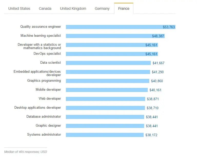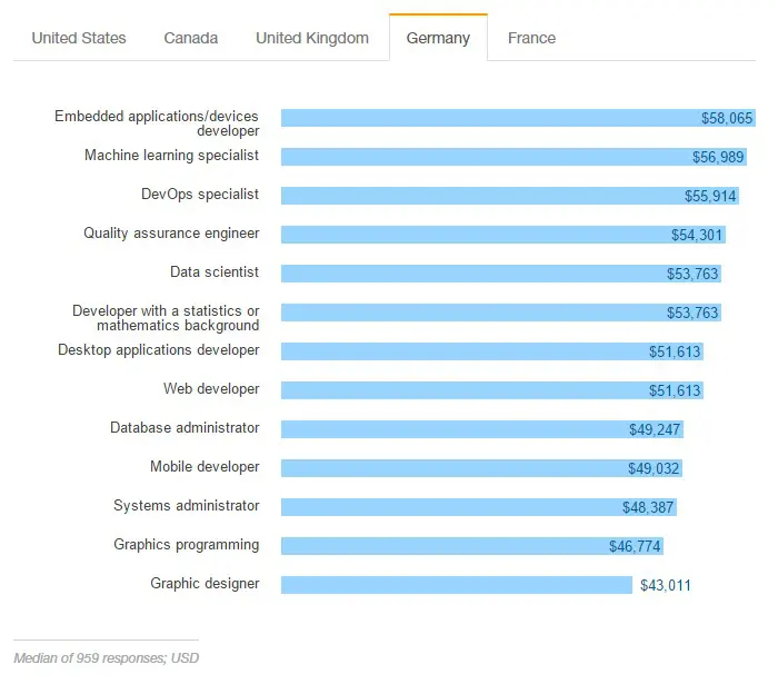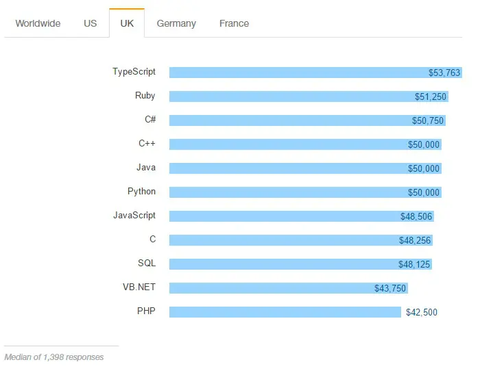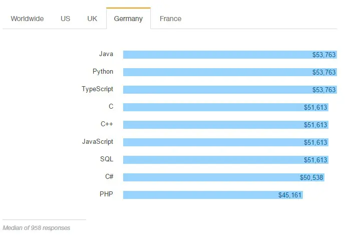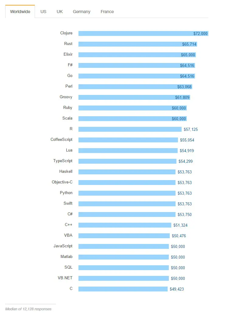 从全球来看,使用 Clojure的开发者年薪最高,平均为7.2万美元。在美国,使用Go和Scala的的开发者年薪最高,平均为11万美元。经过TypeScript开发者年薪最高,平均为53763美元。在德国,Java开发者年薪最高,平局也是53763美元。在法国,Python开发者年薪最高,平均为42151美元。
