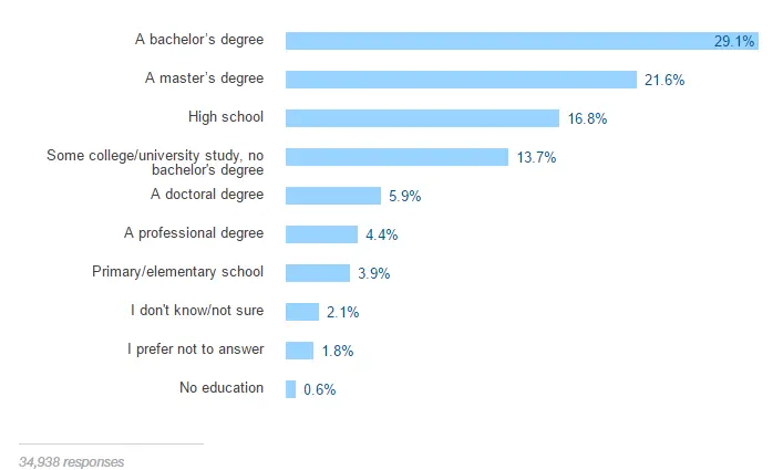 在所有职业开发者中,76.5%的受访人拥有学士或以上的学历。