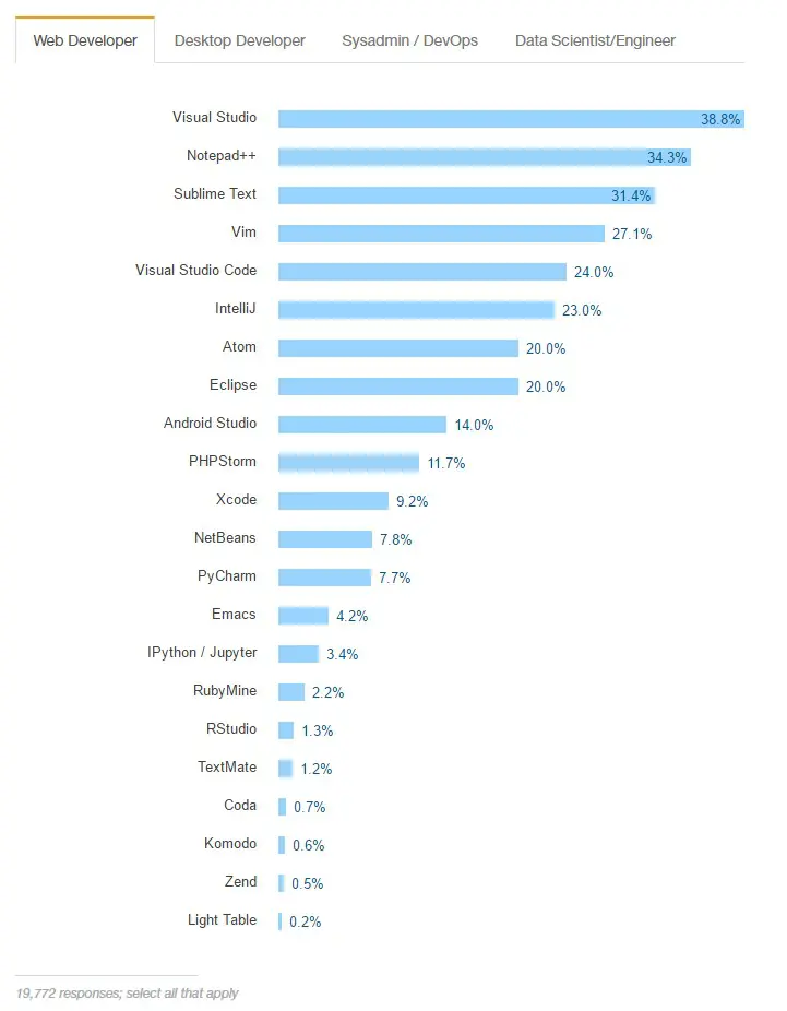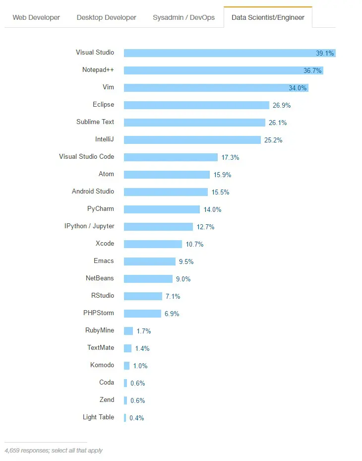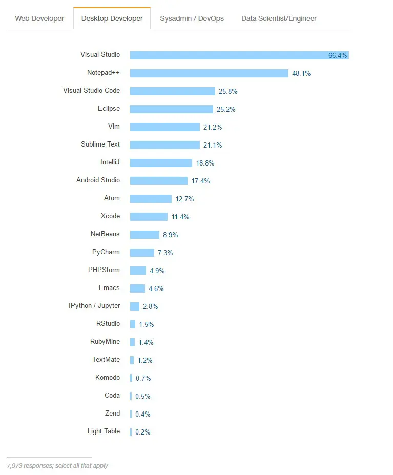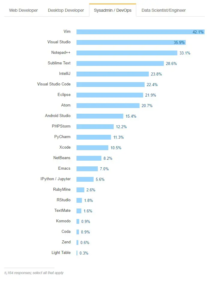 Visual Studio是Web开发者、桌面程序开发者和数据科学家使用最多的开发环境。而系统管理员/DevOps则更偏爱Vim。