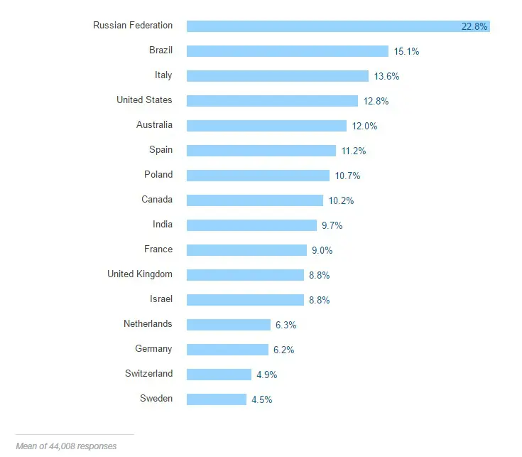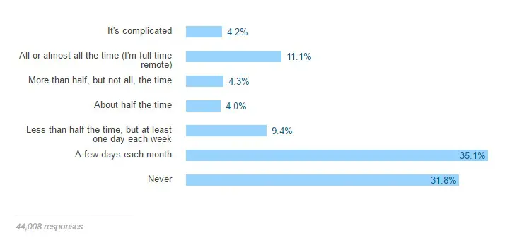 俄罗斯开发者远程工作开发者占比最高,几乎是美国开发者的两倍。