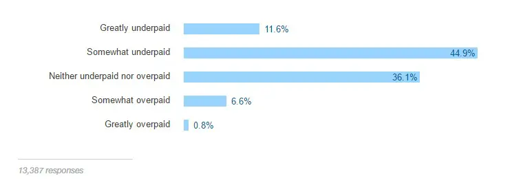 大多数开发者认为自己的薪资过低。供职于政府部门和非盈利机构的开发者薪资最低,供职于财经企业的开发者薪资最高。