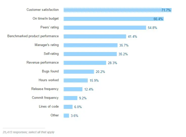 受访者认为,最好的对开发者进行评估的方式就是客户满意度,是否能够准时完成工作以及是否能在预算内完成工作。