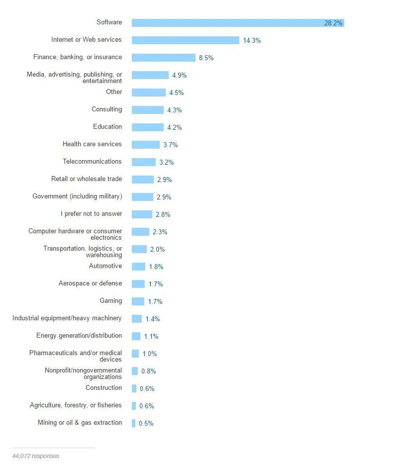 大多数开发者供职于软件、物联网公司。除了这两类公司之外,也有相当一部分开发者供职于其他类型的企业。以美国举例,一些开发者还供职于医疗健康企业、政府部门。