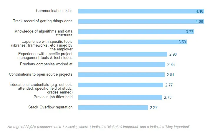 开发者认为,雇主在招聘的时候最应该看重的是沟通技巧以及过往的项目记录。