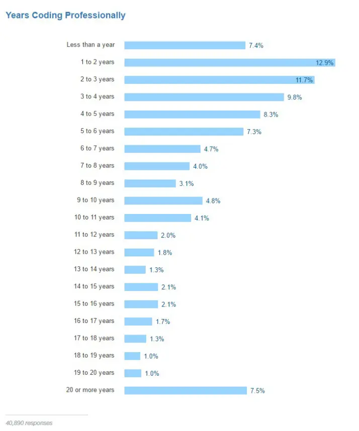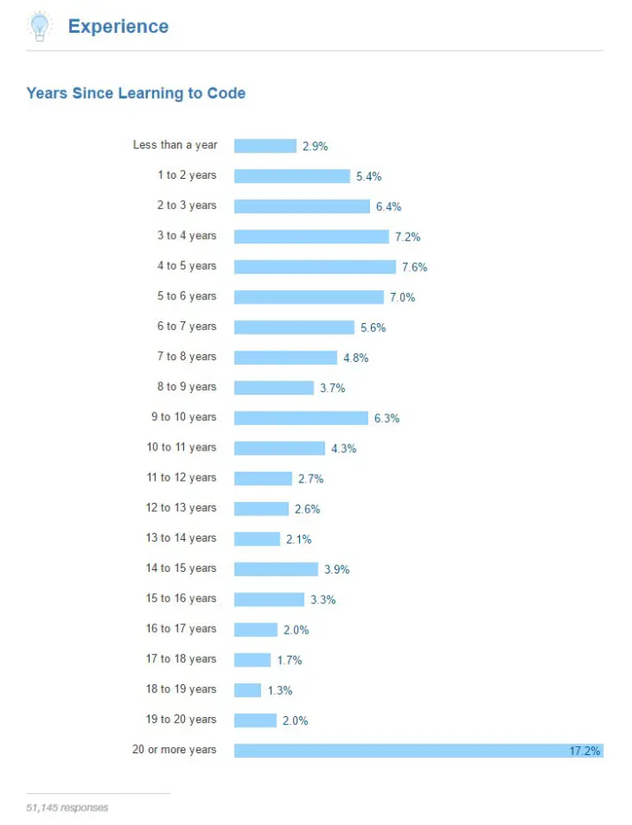 很多人对开发者都有一个误解:这些人都是从小就开始写代码。事实上,在所有专业开发者当中,12.5% 的人编程经验低于4 年,13.3% 的人编程经验在4-6 年之间。随着在线课程和编程训练营的兴起,很多人都是在成年之后才开始学习代码编写的。