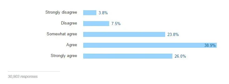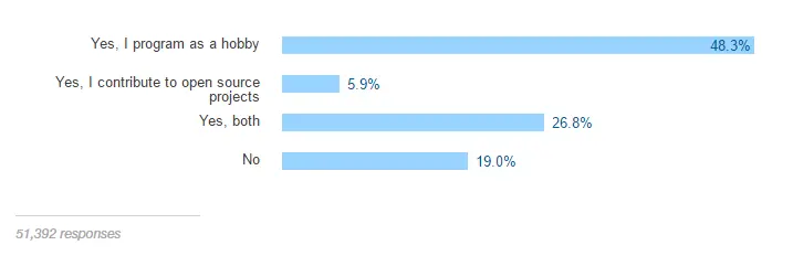 编程不仅仅是一个职业,还可以成为一个爱好。在所有开发者中,75%的受访者都将其视为爱好;另外,还有32.7的开发者表示自己曾经为开源项目做过贡献。