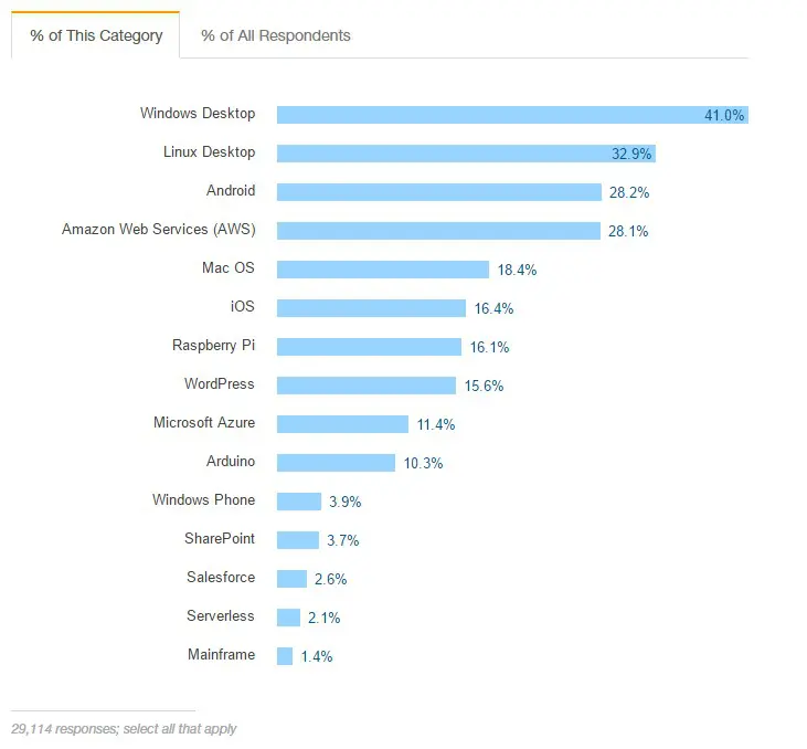Windows系统仍是开发者最常用的系统,紧随其后的是 Linux 系统。