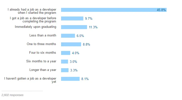 由于人才市场上开发者的稀缺,编程训练营变得红火起来。虽然很多人都将其视为成为开发者的一种重要方式,但是45.8%的受访人都表示他们在进入编程训练营之前已经成为了开发者。因此可以说编程训练营也成为了开发者提升自我技能的一个方式。
