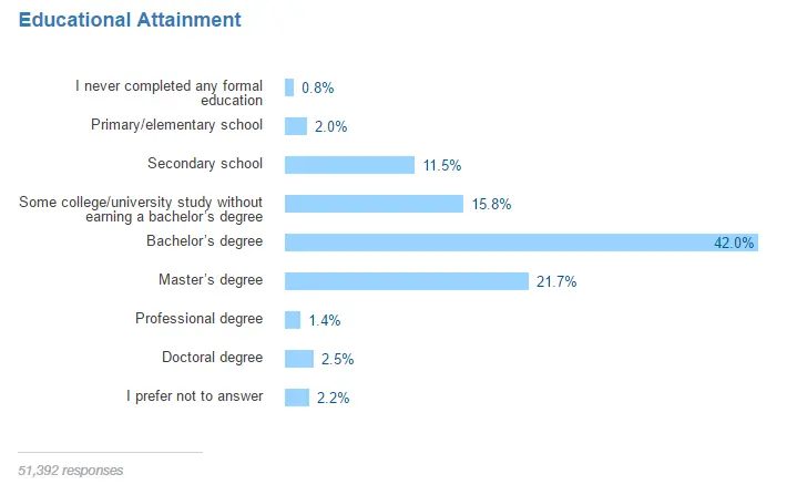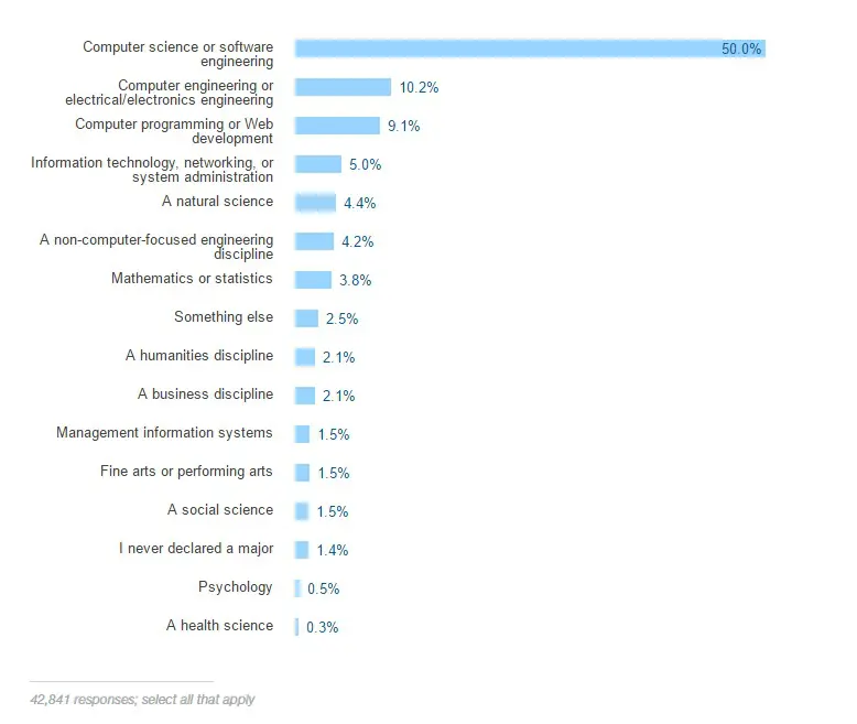 54.2%的职业开发者在大学期间学的是计算机科学或是软件工程;24.9%毕业于开发相关专业,例如计算机编程、计算机工程或是信息技术。剩下的20.9%毕业于其他专业,例如商业、社会科学、自然科学、非计算机工程或艺术专业。