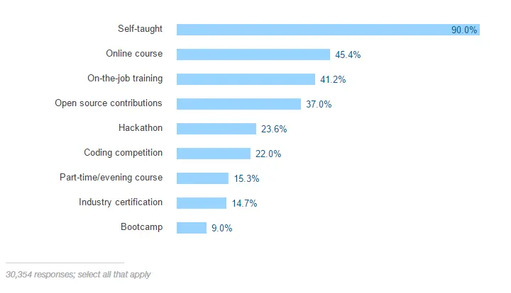 都热爱学习:90%的受访者都有过自学经历。在所有职业开发者中,55.9%的受访者表示他们都参加过线上课程,53.4%的人表示他们接受过在职培训。