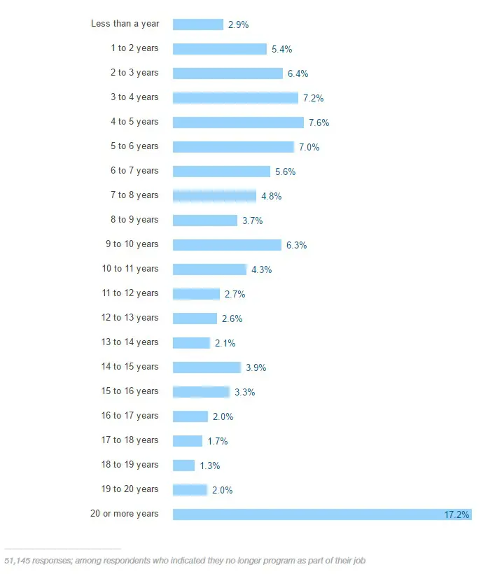 这些人是曾经做过开发者的人,后来转投其他行业。我们询问了他们过去做开发者的年限。