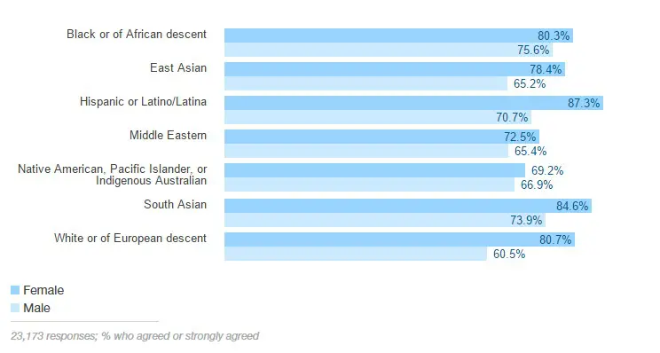 女性开发者更看重办公室中的人才多样性。白人男性员工则最不看重这一点。