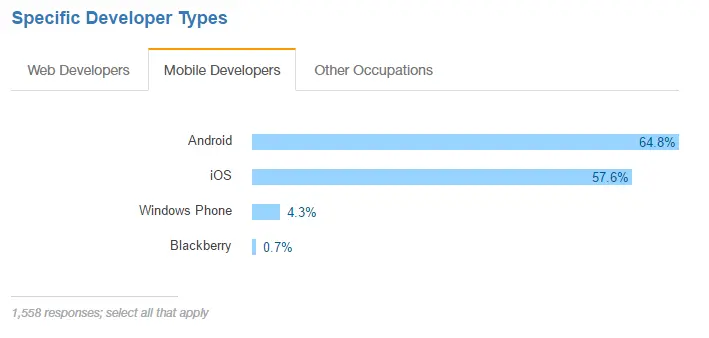 与世界其他地方相比,美国的全栈web开发者数量最多,德国则最低。在移动开发者方面,美国和英国iOS开发者数量高于Android开发者。