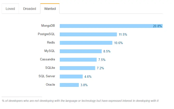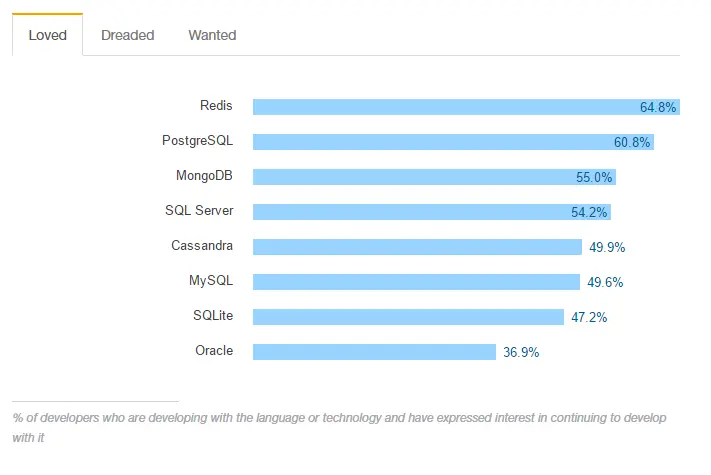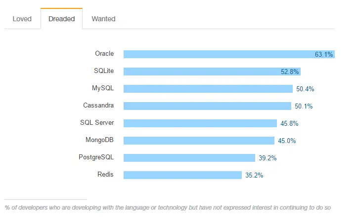 Redis为开发者最爱数据库。Oracle为最让人害怕的数据库。另外,今年越来越多的开发者希望能够使用MongoDB数据库。