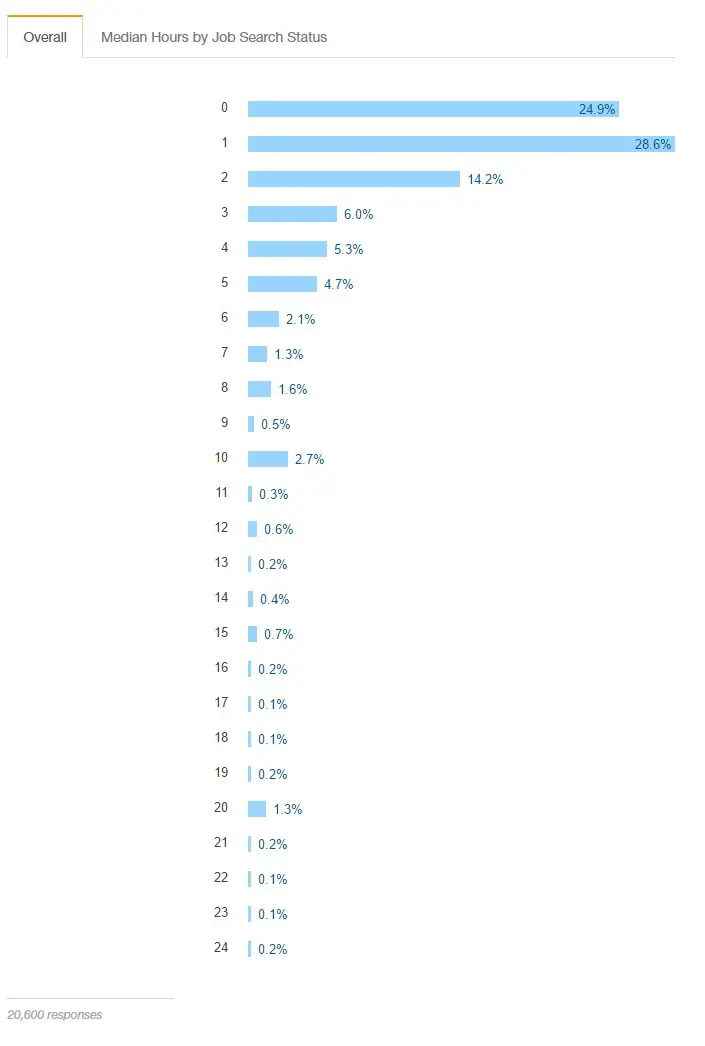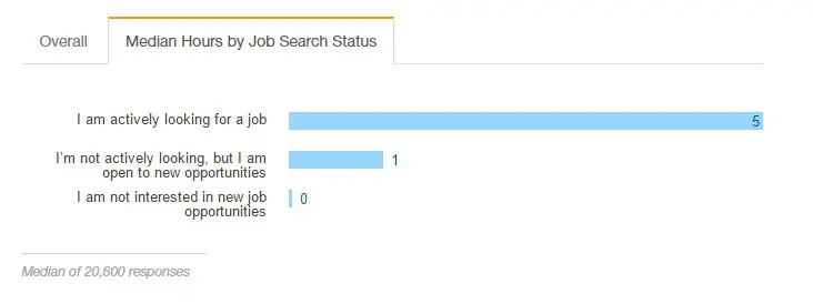 积极找工作的开发者平均每周花费5小时来寻找工作机会。那些换工作意愿不是很高的开发者每周花费1小时左右。