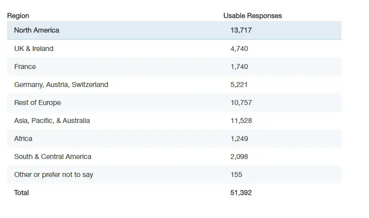 .共有来自213个国家,64227名开发者参与了这次调查。