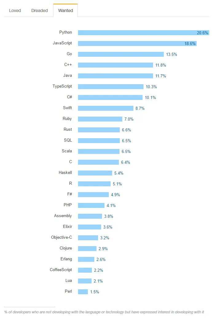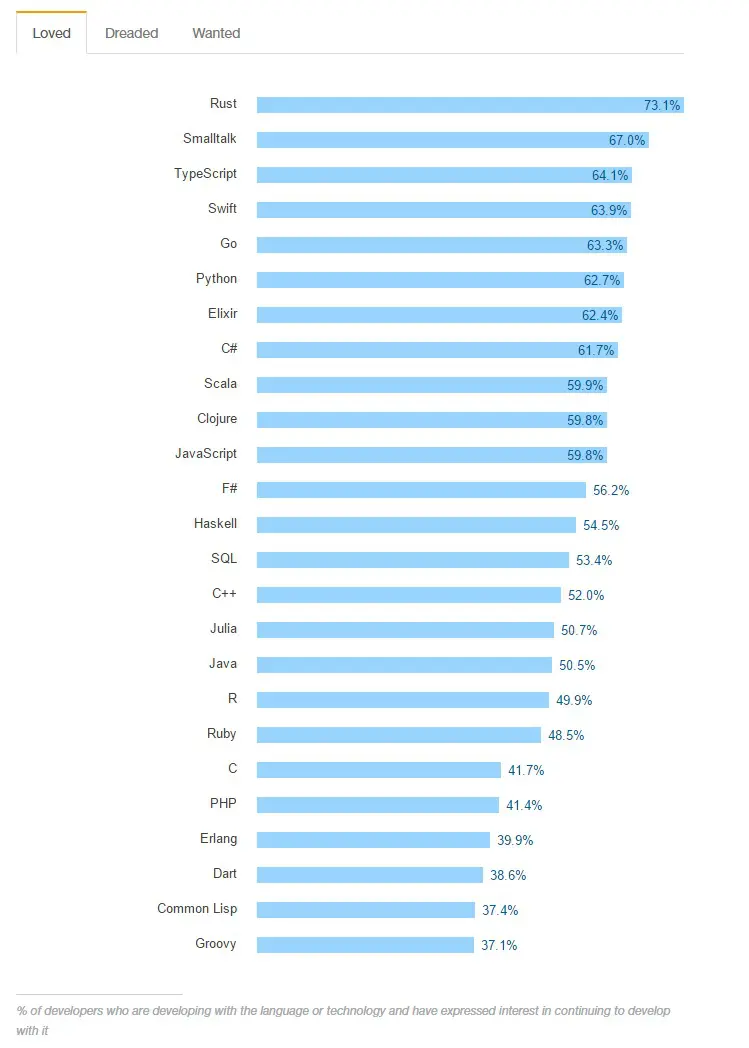 Rust当选今年最受喜爱的语言。Swift从去年第二的位置跌到第四名。