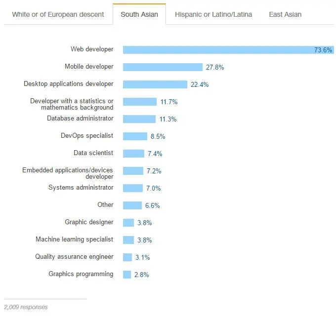 南亚地区、东亚地区、西班牙和拉丁美洲人种,白人和欧洲人种成为移动开发者的意愿更低。西班牙和拉丁美洲人种相比其他地区的人成为Web开发者的意愿更高。