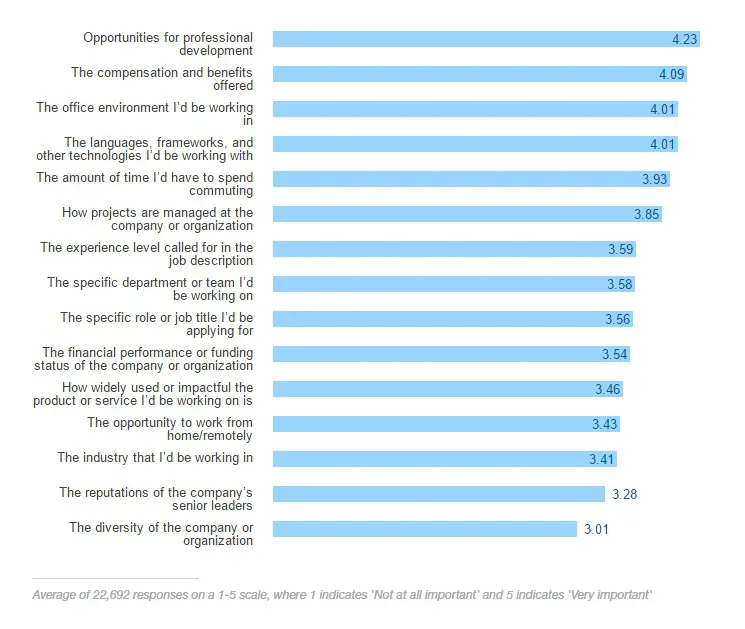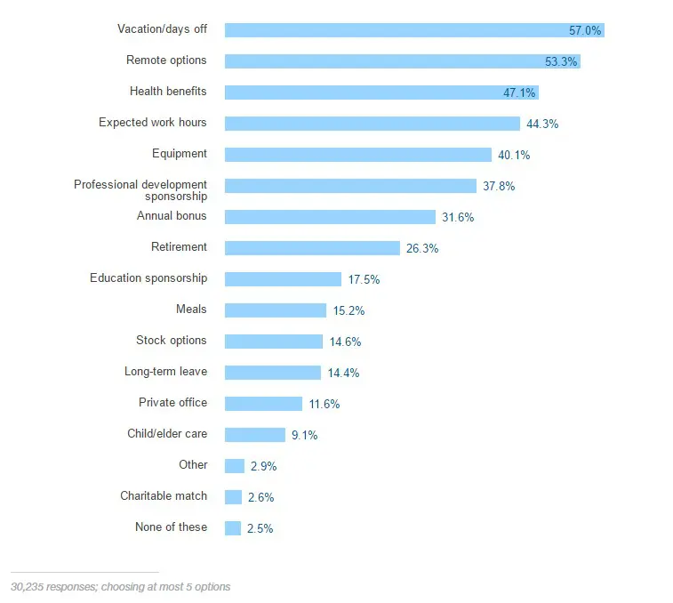 开发者非常看重各种福利,例如假期、是否可以在家工作以及医疗福利。