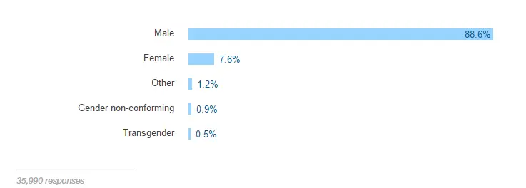 Stack Overflow在美国的流量中,女性占据10%,本次调查问卷的受访人中女性同样占据10%。去年的调查中,女性占比6.6%。