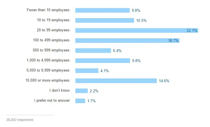 各种规模的企业都有雇佣开发者的需求。总体来看,美国开发者所供职的企业规模高于其他地区。