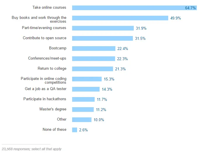 大量的开发者都推荐线上课程进行编程学习,紧随其后的为读书/做练习。