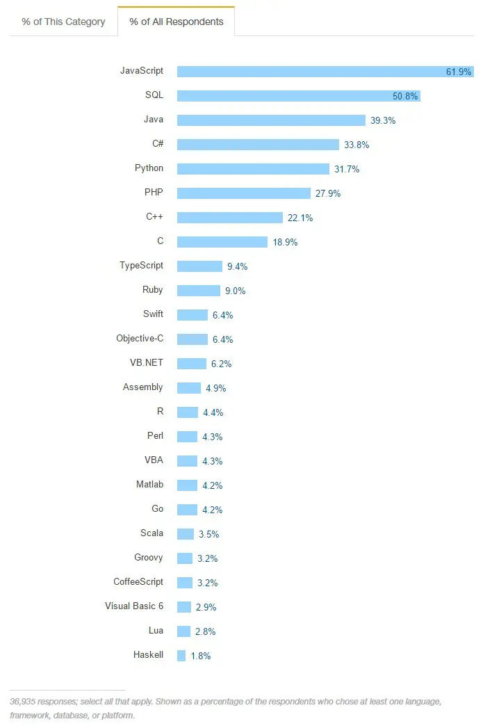 JavaScript连续五年成为了最受欢迎、被使用程度最高的编程语言。SQL排在第二,Java排在第三。今年Python取代PHP进入了前五。