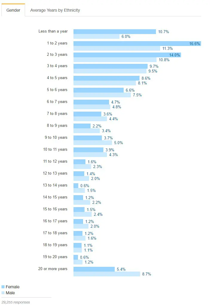 在男性和女性开发者当中,工作年限在一年以下的女性开发者数量是男性开发者数量的两倍左右。总体来看,白人或欧洲裔开发者、太平洋岛民后裔以及澳洲土著后裔开发者的工作经验最多。