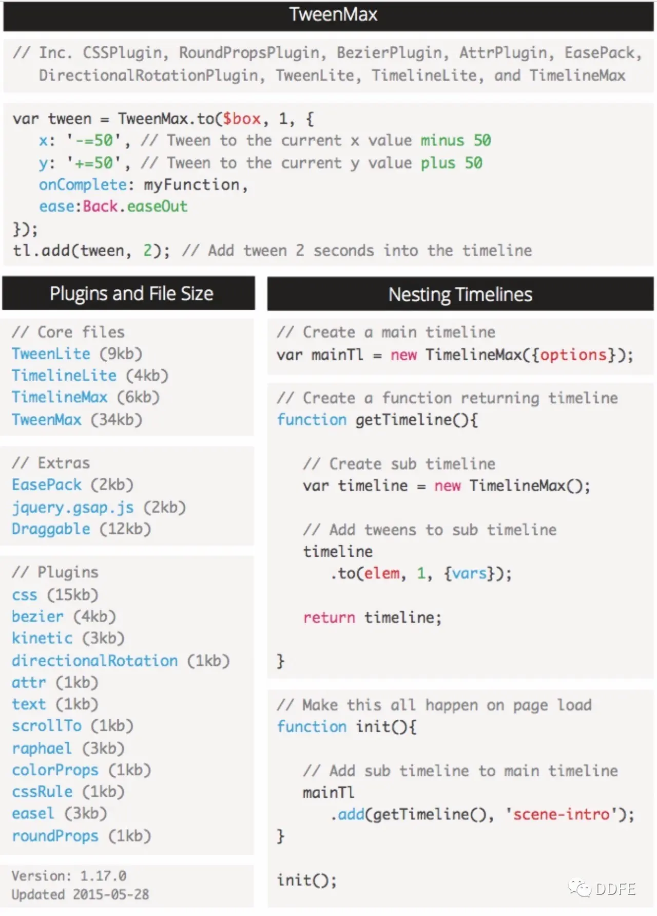 GSAP(GreenSock Animation Platform)一套用来创建动画的‘工具’,使创建动画简单、快速、直接。它包括:TweenLite: 核心方法,动画方面是主要负责对元素对象的相关属性进行动画操作。TweenLite 是个轻体积的但是却足够还实现常见动画以及可以扩展其他可选插件(如 CSSPlugin、ScrollToPlugin )TweenMax: TweenLite 的重体积版,也就是完整版。它不仅能实现 TweenLite 所有动画效果及动作,还可以实现 repeat、 yoyo、 repeatDelay 等等类似行为。它本身里就包括了类似 CSSPlugin 的一些插件,所以我们不需要再另引入。努力成为功能全面而不仅仅是轻体积。TimelineLite: 一个轻体积,很有用的用于来排列和管理你的动画序列,让你的一系动画在“时间线”上,以及每个动画之间的相互关系可以很容易的被准备的控制管理。你也可以把一个‘“时间线”嵌套到另一个“时间线”上,嵌套多少层都没关系 。可以使你的动画流程容易模块化。timelineMax: TimlineLite 的扩展版,包含 TimelineLite,且额外还有 repeat, repeatDelay, yoyo, currentLabel() 等等的功能函数。其实就是像 TweenLite 与 TweenMax 的关系。比 TimelineLite 功能更加全面。