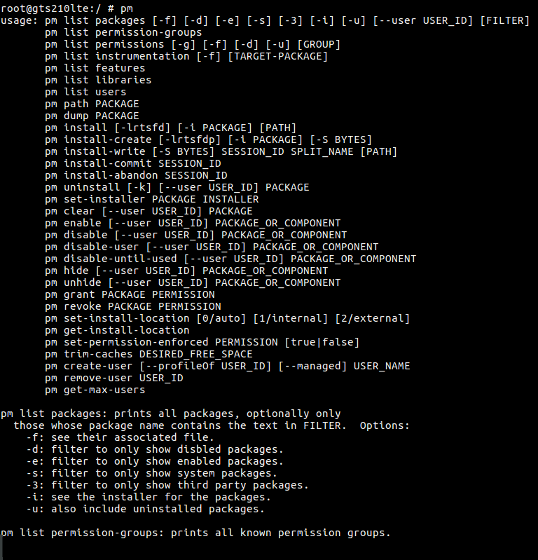pm是包管理(package manager)的简称, 我们可以使用pm命令来执行应用的安装和查询应用的信息、系统权限、控制应用, 等等。