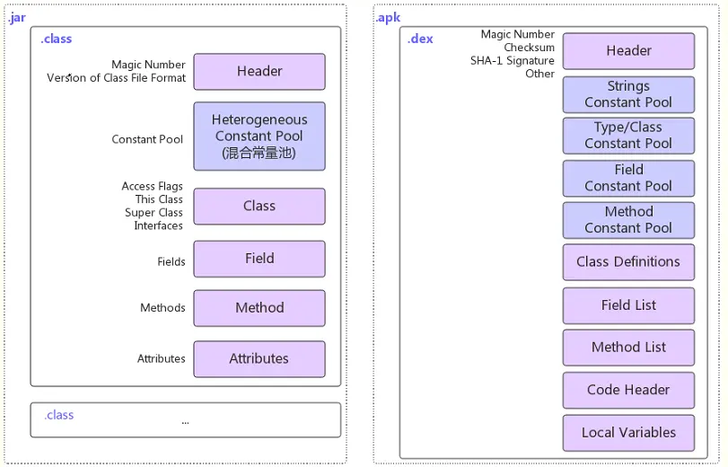 简单来讲,dex格式文件就是将多个class文件中公有的部分统一存放,去除冗余信息。