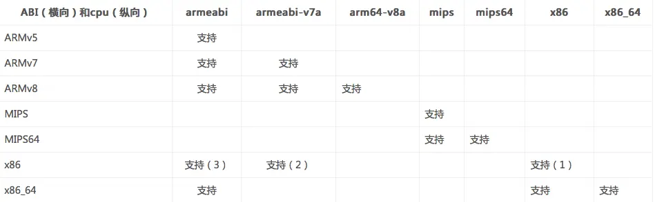 应用程序二进制接口ABI(Application Binary Interface)定义了二进制文件(尤其是.so文件)如何运行在相应的系统平台上,从使用的指令集,内存对齐到可用的系统函数库。在Android 系统上,每一个CPU架构对应一个ABI:armeabi,armeabi-v7a,x86,mips,arm64- v8a,mips64,x86_64。分别对应着下面7种CPU架构ARMv5,ARMv7 (从2010年起),x86 (从2011年起),MIPS (从2012年起),ARMv8,MIPS64和x86_64 (从2014年起),每一种都关联着一个相应的ABI。
