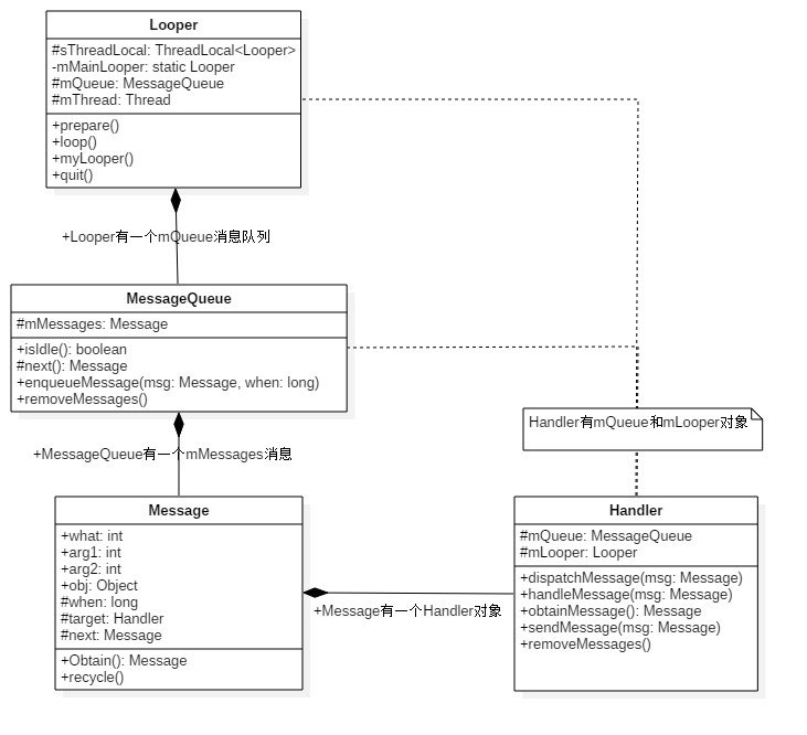 MessageQueue:消息队列,但是它的内部实现并不是用的队列,实际上是通过一个单链表的数据结构来维护消息列表,因为单链表在插入和删除上比较有优势。主要功能向消息池投递消息(MessageQueue.enqueueMessage)和取走消息池的消息(MessageQueue.next);