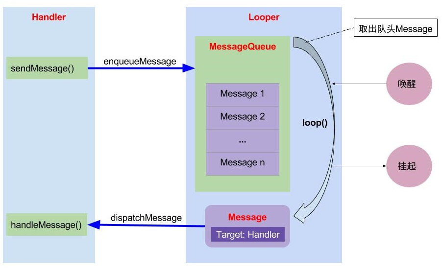当next()取出下一条消息时,队列中已经没有消息时,next()会无限循环,产生阻塞。等待MessageQueue中加入消息,然后重新唤醒。