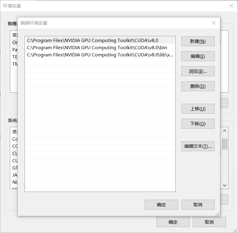 默认cuda环境变量是C:\Program Files\NVIDIA GPU Computing Toolkit\CUDA\v8.0, 但是这样还不够,不能访问bin和lib\x64下的包
