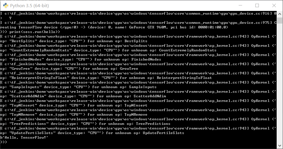 如果能够输出'Hello, TensorFlow!'像下面这样就代表配置成功了
