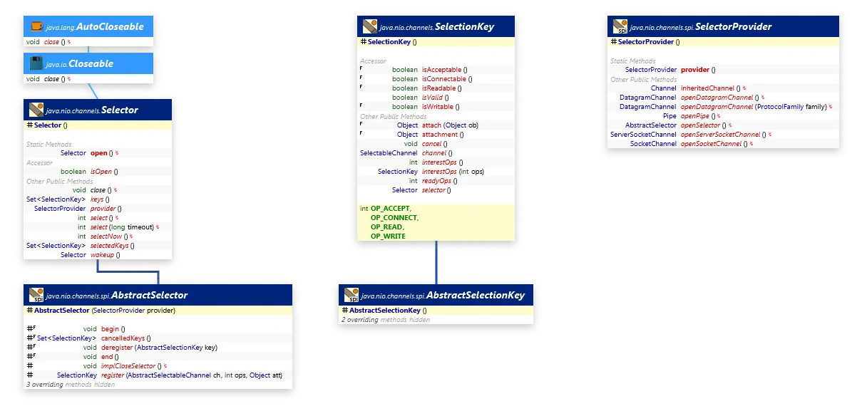 Selector的使用比较简单,同时要配合SelectionKey使用,它们的继承结构图也比较简单,如下: