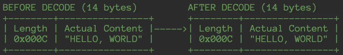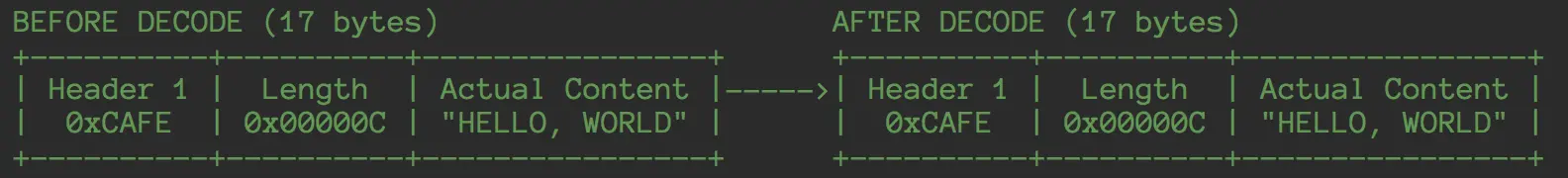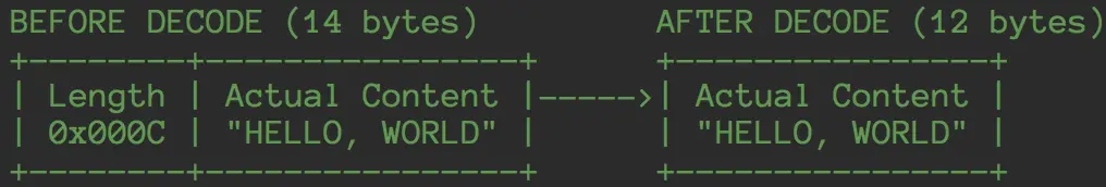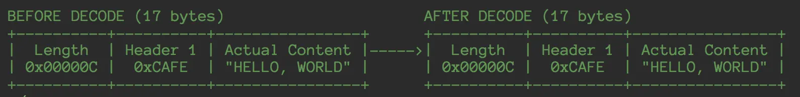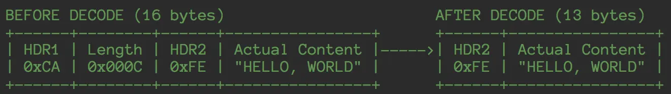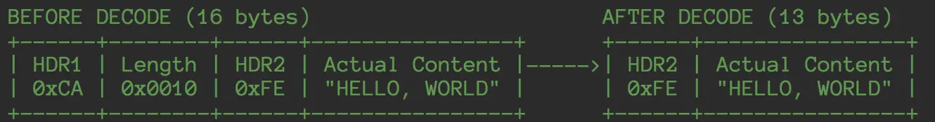 拆完之后,HDR1 丢弃,长度域丢弃,只剩下第二个header和有效包体,这种协议中,一般HDR1可以表示magicNumber,表示应用只接受以该magicNumber开头的二进制数据,rpc里面用的比较多