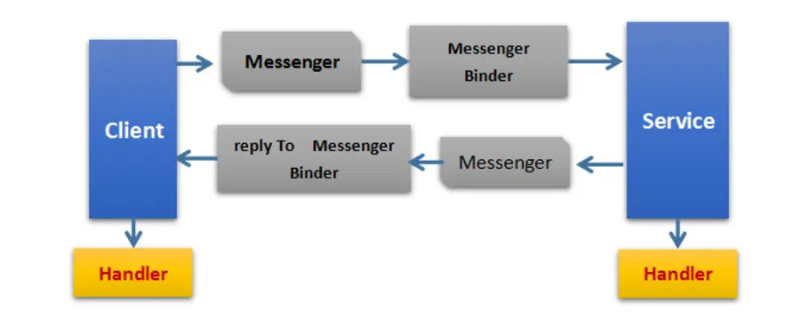 public class MessengerActivity extends Activity{ private ServiceConnection conn = new ServiceConnection(){ @Override public void onServiceConnected(ComponentName name, IBinder service) { //根据得到的IBinder对象创建Messenger mService = new Messenger(service); //通过得到的mService 可以进行通信 } }; //为了收到Service的回复,客户端需要创建一个接收消息的Messenger和Handler private Handler MessengerHander = new Handler(){ @Override public void handleMessage(Message msg) { //消息处理 } }; private Messenger mGetMessenger = new Messenger(MessengerHander); @Override protected void onCreate(Bundle savedInstanceState) { super.onCreate(savedInstanceState); setContentView(R.layout.activity_messenger); init(); } private void init() { intent = new Intent(MessengerActivity.this, MessengerService.class); indService(intent, conn, Context.BIND_AUTO_CREATE); } @Override protected void onDestroy(){ unbindService(conn); super.onDestroy(); } }下面给出一张Messenger的工作原理图,以便于更好的理解Messenger: