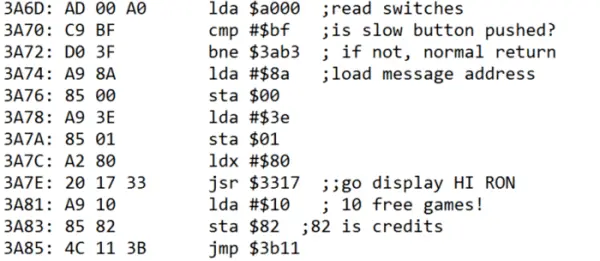 于是Ron Milner很高兴地对他的粉丝说:“那是我第一个也是唯一一个游戏作品,我觉得可能也是世界上第一款有彩蛋的游戏。30年来(其实是40年),我没跟任何人说,包括雅达利,不过我这里有些代码,如果你做一系列操作,它会说‘HI RON!',然后给你10条免费的命。“