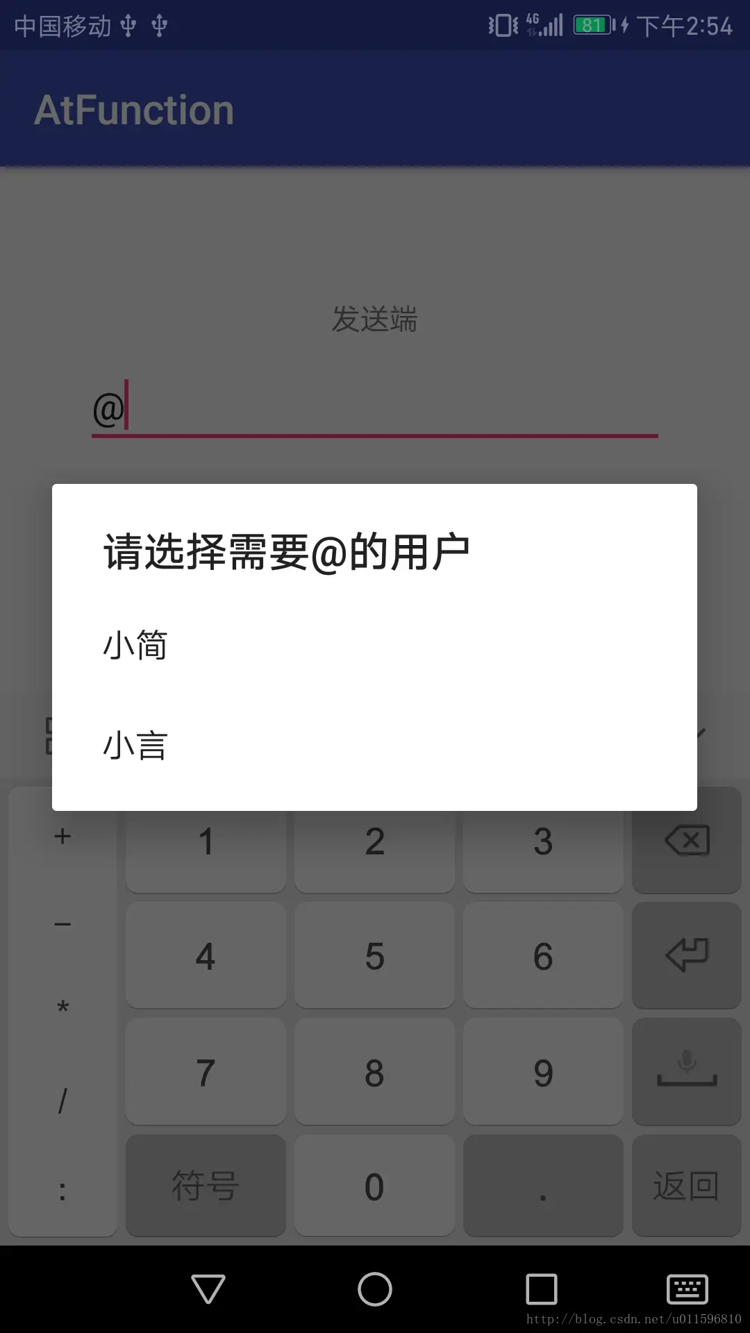 - 在输入框中输入@,弹出一个页面给用户选择所需要@的用户