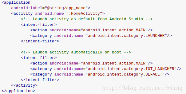Android Things只支持单应用,应用总入口为”home activity”。AndroidManifest.xml文件中,intent filter必须包括两项内容: