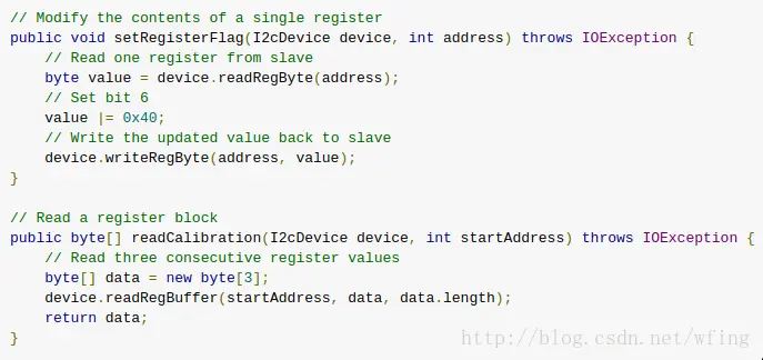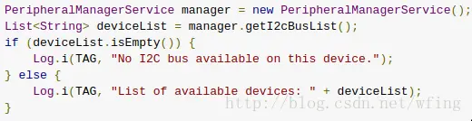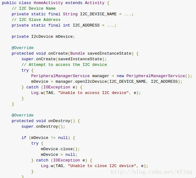 关键的接口是 manager.openI2CDeivce(..),这个函数有两个参数,DEVICE_NAME 是用户定义的一个字符串,表示设备的名称。I2C_ADDRESS,也是之前所说的 I2C 从设备上的地址,这个地址在当前的 I2C 总线上是唯一的。