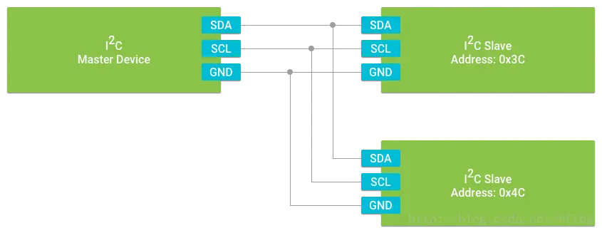 其中,写有 Master Device 的 I2C 设备,称为主设备,另外两个为从设备。从主设备引出的 SDA 和 SCL 线,构成 I2C 的总线。一个 I2C 的主设备可以提供一条 I2C 的总线。一条总线上,最后可以连接 127 个 I2C 的从设备。