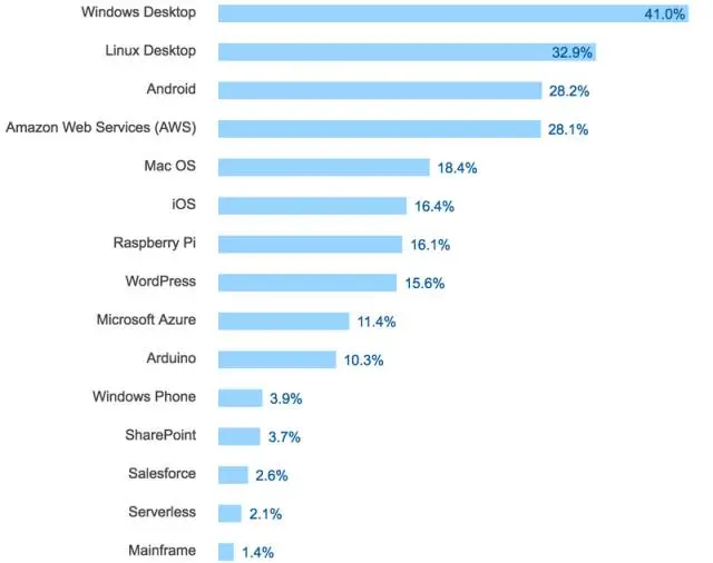 Windows 是开发人员最常用的平台,其次是 Linux 。